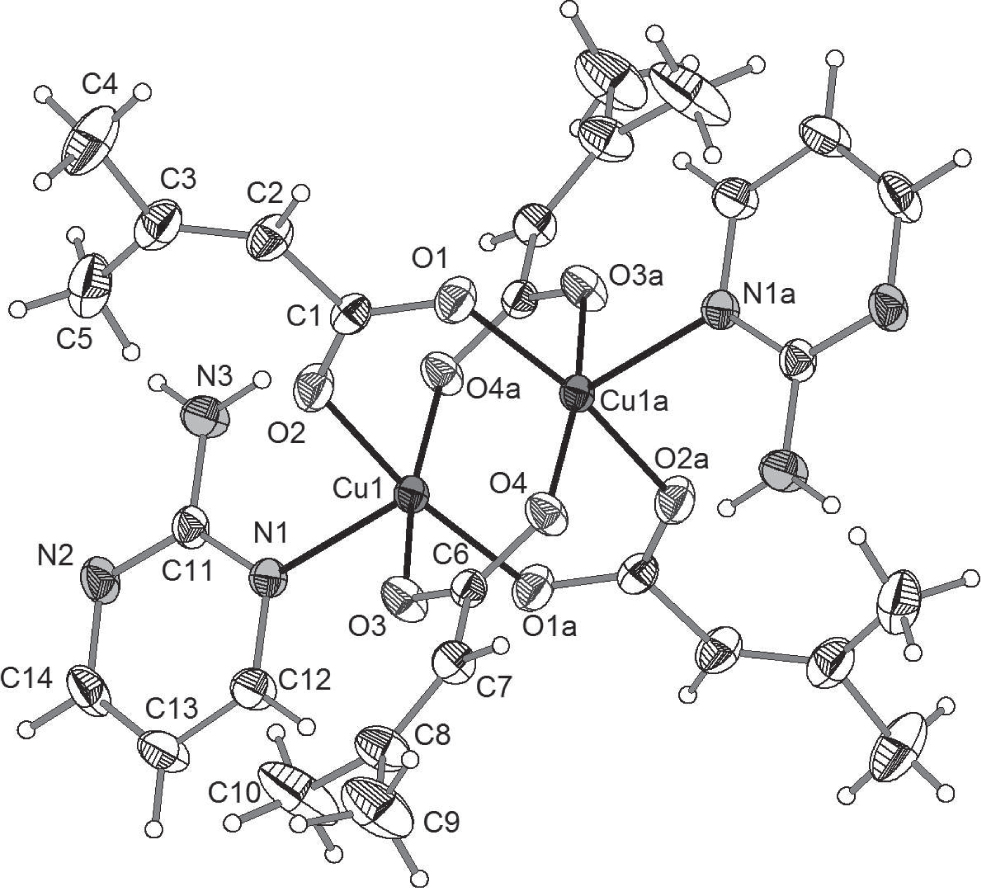Metal carboxylate complexes are one of the most important classes in coordination chemistry [3], [4], [5]. Especially, Cu(II) carboxylates with nitrogen donor ligands have been extensively studied due to their importance in biology and magnetism [6], [7], [8], [9]. In this study we report a new copper(II) complex containing 3,3–dimethylacrylate and 2–aminopyrimidine.