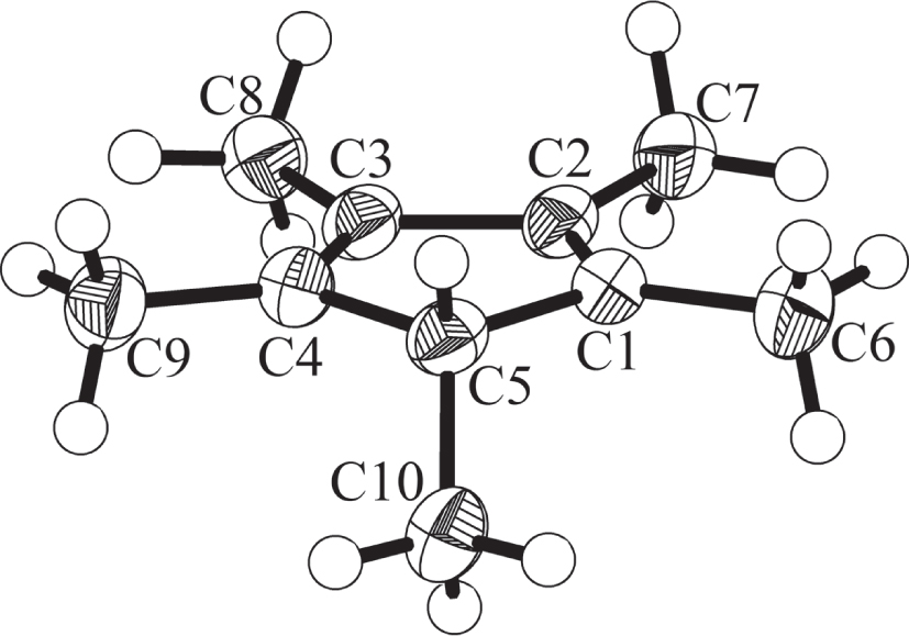 According to the crystal structure, nine C atoms of the title molecule, C1 to C9, are in plane (cf. the figure). Within the C5 ring, the C1—C2 and C3—C4 double bonds are 1.343(3) Å and 1.328(4) Å, respectively, while the single bonds are in the range between 1.487(3) Å and 1.512(3) Å, the shortest one between C2 and C3 connects the double bonds. These values are very close to those in CpH [13]. The C—C bond lengths between the methyl groups and the formal butadiene moiety are in the same range with that to the exo-plane methyl group being the longest (1.487(3) Å to 1.503(3) Å, C5—C10 1.528(3) Å). The molecules form a distorted hexagonal rod packing parallel to the crystallographic a axis.