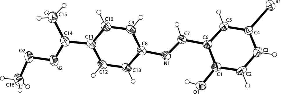 All chemicals were used without further purification. 4-amino acetophenone methoxy oxime was prepared by a method reported earlier [1], [2], [3]. To an ethanol solution (5 mL) of 5-bromosalicylic acid (201.0 mg, 1 mmol) was added an ethanol solution (5 mL) of 4-aminoacetophenone methoxy oxime (164.0 mg, 1 mmol). The solution was stirred at 328 K for 12 h. The residue was washed with ethanol and hexane, then place in the drying oven for 2 days to get a light brown powder (yield 78%, m.p. 412–413 K). Crystals were obtained by slow evaporation from a mixture of chloroform, acetone and methanol at room temperature. Elemental analysis: Anal. calcd. for C16H15BrN2O2: C, 55.35%; H, 4.35%; N, 8.07%; Found: C, 55.33%; H, 4.33%; N, 8.01%.