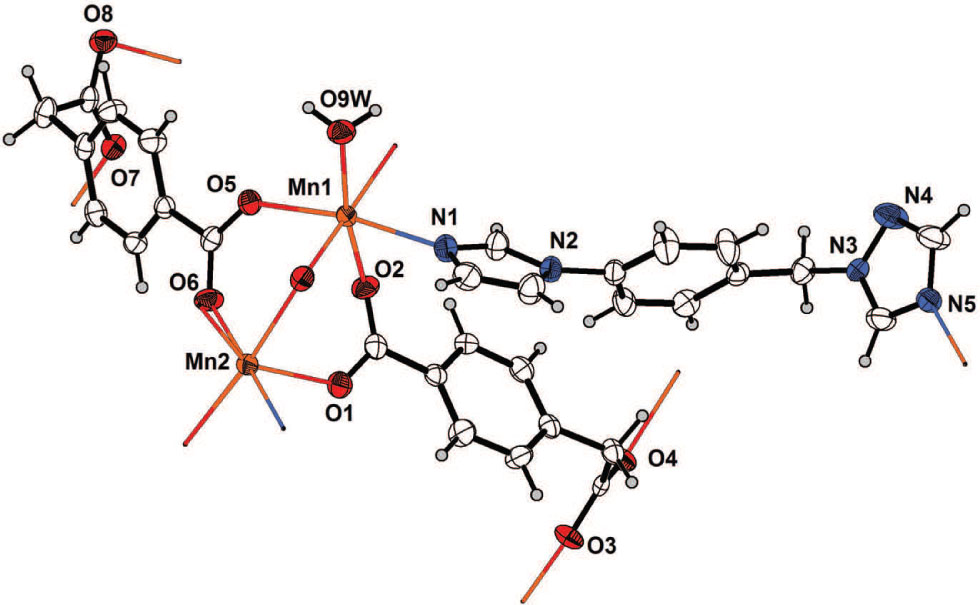 A mixture of Mn(OAc)2 ⋅ 4H2O (24.5 mg, 0.1 mmol), homoterephthalic acid (H2htpa, 36.0 mg, 0.2 mmol), 1-(imidazolyl)-4-(1,2,4-triazol-1-ylmethyl)benzene (itmb, 22.5 mg, 0.1 mmol) and H2O (7 mL) were placed in a 23 mL Teflon-lined autoclave at 393 K for 4 days, then cooled to room temperature. Colourless block crystals were obtained in ca. 86% yield. Elemental analysis calcd. (%) for C30H25N5O9Mn2: C, 50.74; H, 3.59; N, 9.88. Found: C, 50.79; H, 3.55; N, 9.87.