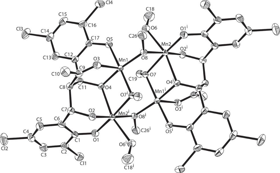 The title complex consists of four Mn(III) atoms, two 4-(3,5-dichloro-2-hydroxy-phenyl)-3-[(3,5-dichloro-2-hydroxy-phenyl)-hydroxy-methyl]-4-hydroxy-butan-2-one ligands as well as methanolato and methanol ligands (cf. the figure). Mn1 and Mn1i atoms are five-coordinated, but Mn2 and Mn2i atoms are six-coordinated. Mn1/Mn1i has a distorted square-pyramidal coordination environment with three oxygen atoms from (L)4− and two oxygen atoms provided by two methanolato ligands. Mn2/Mn2i has a distorted octahedral coordination environment with three oxygen atoms from (L)4− and three oxygen atoms provided by two methanolato ligands and one oxygen atom of a coordinated methanol molecule. Bond lengths and angles are all in the expected ranges.