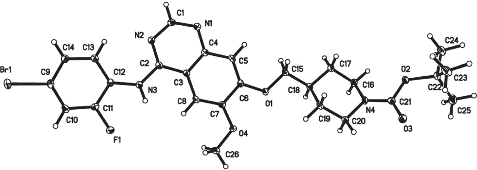 - A single crystal study on tert-butyl-4-((4-(4-bromo-2-fluorophenylamino)-6-methoxyquinazolin-7-yloxy)methyl)piperidine-1-carboxylate, C26H30BrFN4O4