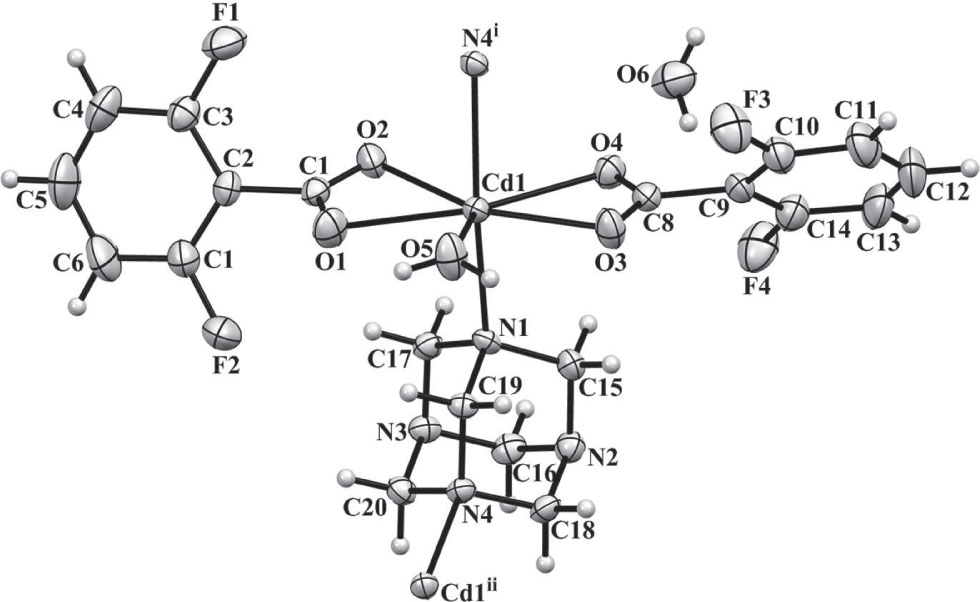 Coordination polymers have received much attention in recent years because of their potential applications such as catalysis, separation, gas storage, luminescence, and magnetism [3], [4], [5]. The traditional strategy of construction of coordination polymers is the self-assembly of organic molecules and metal ions. Bi- or polytopic molecules such as anionic aromatic acids and neutral N-containing heterocyclic molecules are usually used as organic ligands for extending the structures. Among various aromatic acids, the “parent” acid, namely, benzoic acid or its substituted derivatives, have been utilized rather rarely in literature because it has only one carboxyl group, although some polynuclear clusters have been reported so far [6], [7], [8]. The fluorine substituted molecules are good candidates for construction of functional coordination polymers, because they are more stable to oxidation and show enhanced thermal stability [9]. Usage of pentafluorobenzoate as ligand has been reported in some studies, while only few complexes with 2,6-difluorobenzoate (dfba) as ligand have been reported [10, 11] . On the other hand, for the N-heterocyclic ligands, hexamethylenetetramine (hmt), which has four coordinating N atoms, is a good neutral bridging ligand, not only because it has various coordination modes that span from terminal monodentate to μ2-, μ3-, or μ4-bridging mode; but also because it can act as hydrogen bonding acceptor to generate supramolecular networks [12, 13] .