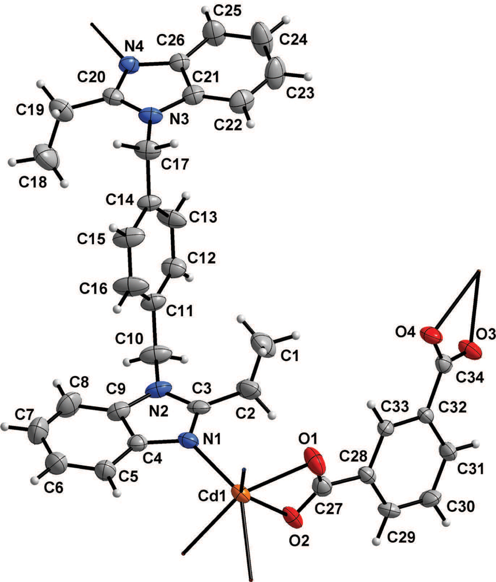 The asymmetric unit of the title structure consists of a 1,4-bis(2-ethylbenzimidazol-1-ylmethyl) benzene (beb), one isophthalate (ip2−), and one Cd(II) ion. As shown in the figure, each Cd(II) is octahedrally coordinated by two N atoms from two beb ligands, and four oxygen atoms from two H2ip. The bond lengths are Cd(1)–O(1) = 2.265(3) Å, Cd(1)–O(2) = 2.468(3) Å, Cd(1)–O(3) = 2.459(3) Å, Cd(1)–O(4) = 2.287(3) Å, Cd(1)–N(1) = 2.369(4) Å, and Cd(1)’–N(4) = 2.309(4) Å, respectively. They are in the normal range [8].