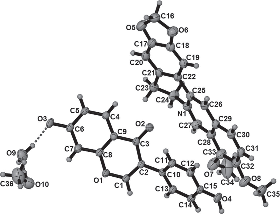 - Crystal structure of 5,6-Dihydro-9,10-dimethoxybenzo[g]-1,3-benzodioxolo[5,6-a]chinolizinium 3-(4-hydroxyphenyl)-4-oxo-4H-chromen-7-olate - methanol - water (1/1/1), C36H33NO10