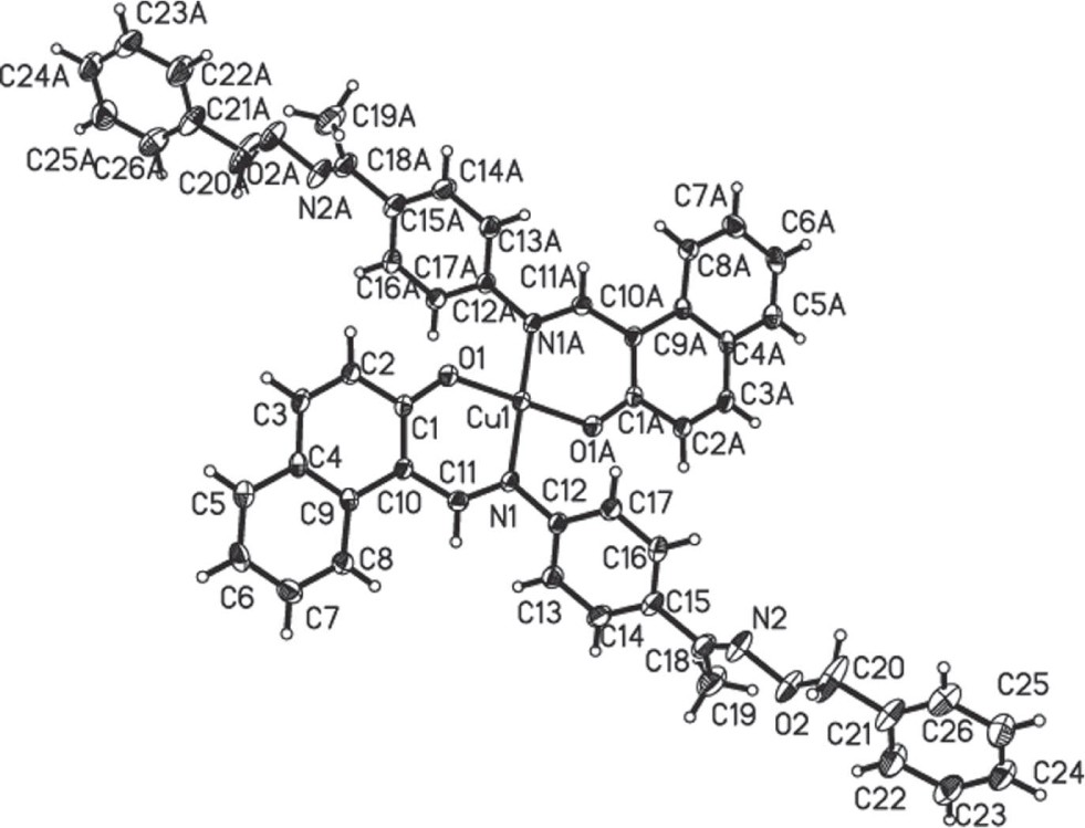 - Crystal structure of bis((1-(((4-(((benzyloxy)imino)methyl)phenyl)imino)methyl)naphthalen-2-yl)oxy-κ2O,N)copper(II), C52H42CuN4O4