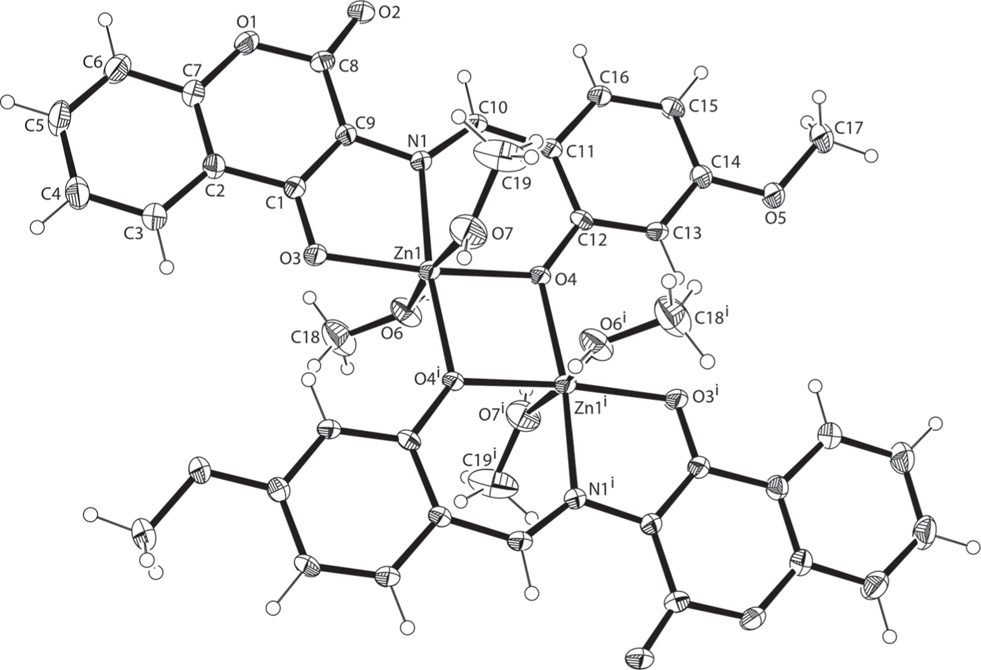 - Crystal structure of tetrakis(methanol-κO)-bis{μ2-3-((4-methoxy-2-oxidobenzylidene)amino)-2-oxo-2H-chromen-4-olate-κ4O,N;O′:O′}dizinc(II), C38H38Zn2N2O14