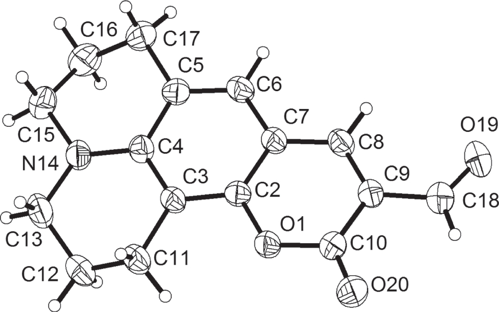 The title compound was synthesized according to standard Vilsmeier-Haack conditions, under which formylation at 3-position of julolidine [2,3]quinolone occurred efficiently [5, 6] . All chemicals used were commercially available of AR grade, and were used as received without further purification. The purple crystals of the title compound were obtained by slow evaporation of an ethanol solution at room temperature.