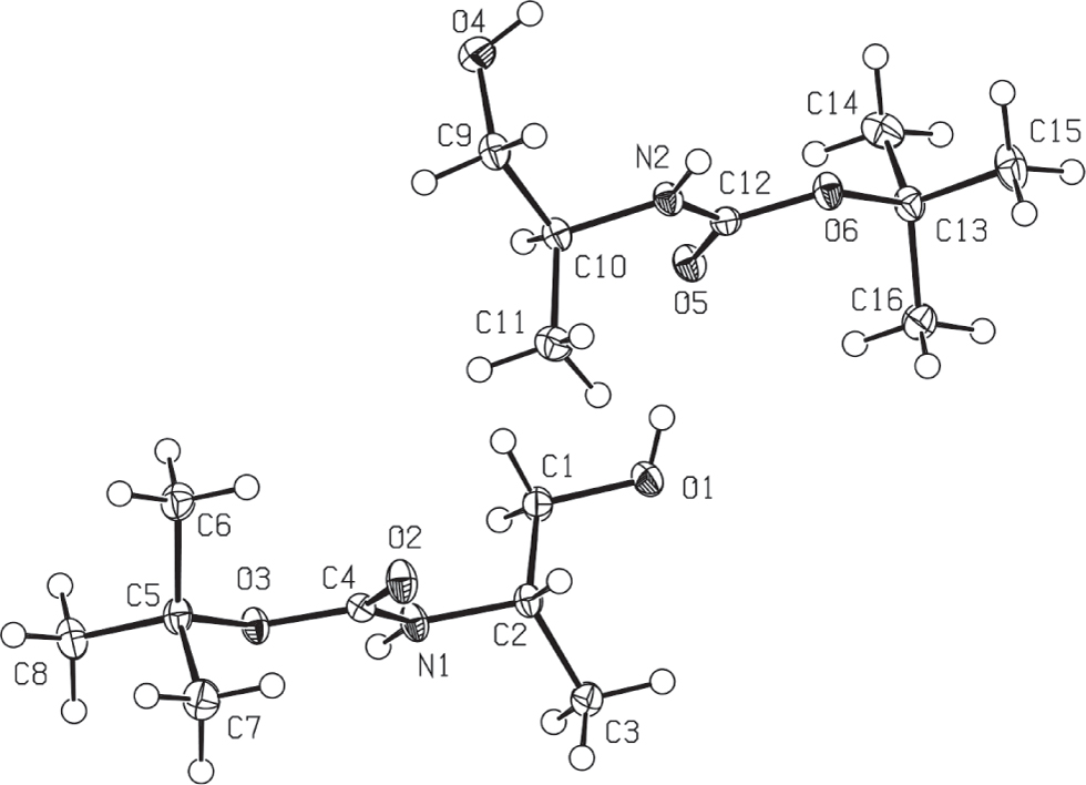 The crystal structure of the title compound contains two symmetrically non-equivalent molecules in the asymmetric unit. Each molecule consists of a tert-butoxy unit and a N-[2-hydroxy-1-methylethyl]amidyl moiety, which confirms the successful synthesis of the title compound. The two molecules also have of a stereogenic centre with S-configuration at C2 in one molecule and C10 in the other (cf. the figure). Classical intermolecular N—H⋯O hydrogen bonding is observed between the amide hydrogen atoms and carbonyl oxygen atoms (N1⋯O2′ = 2.977(2) Å; ′= −x + 1, y − 1/2, −z + 1; N2⋯O5′′ = 3.047(2) Å; ′′= −x + 1, y + 1/2, −z) of neighbouring molecules. Linking in this manner forms chains, which extent along the b axis. The OH groups are involved in classical O—H⋯O hydrogen bonding with carbonyl oxygen atoms (O1⋯O5 = 2.800(2) Å) and OH groups (O4⋯O1′′ = 2.855(2) Å) of neighboring molecules. The O—H⋯O hydrogen bonding patterns sew the chains together resulting in a two dimensional network. All bond lengths and angles are in the expected ranges for this class of compounds [8].