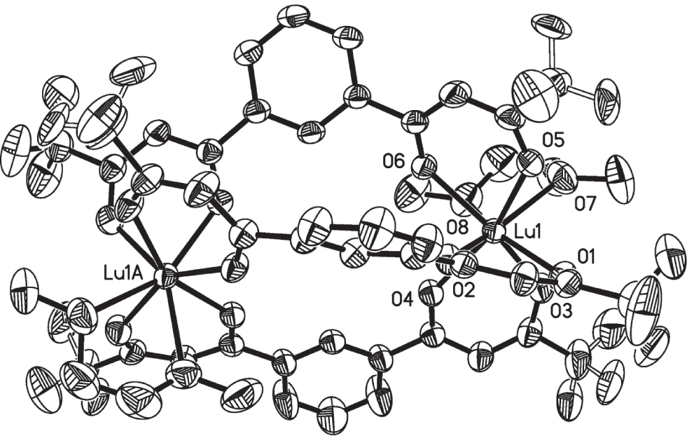 The title compound is easily synthesized by means of reported procedures [3]. To a methanol solution of 1,3-bis(4,4,4-trifluoro-1,3-dioxobutyl)phenyl (1 g, 2.8 mmol), NaOH (0.2 g, 5.6 mmol) was added, and the mixture was allowed to stir for 5 min. To this methanol solution, LuCl3⋅6H2O (1.86 mmol) was added, and the mixture was allowed to stir for 24 h at ambient temperature. Water was then added to this mixture, and the precipitate thus formed was filtered, washed with water, and dried in air to give the title compound in a yield of 62.1%. Crystals were obtained in about two weeks by recrystallization from DME/hexane.