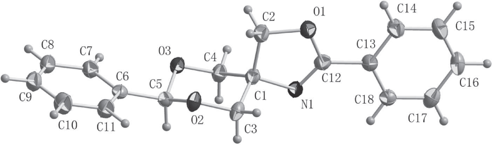 Herein, we report on a new oxazolidine derivative, which was synthesized and characterized by single-crystal X-ray diffraction [2, 3] . In the structure, there are two new formed rings, C(1)—C(3)—O(2)—C(5)—O(3)—C(4) and C(1)—N(1)—C(12)—O(1)—C(2). The bond lengths of N(1)—C(1), N(1)—C(12) are 1.4746(15) Å and 1.2706(16) Å respectively. All geometric parameters are in the expected ranges [8, 9] .
