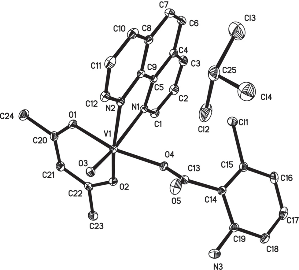 The structure of the compound title compound is shown in the Figure. It is a neutral oxovanadium complex with mixed acac, 1,10-phenanthroline and 2-amino-6-chlorobenzoato ligands. The central vanadium atom has a octahedral environment being coordinated by two oxygen atoms of acac, two nitrogen atoms of 1,10-phenanthroline, one oxygen atom of 2-amino-6-chlorobenzoate and one oxido ligand. The ligands of 1,10-phenanthroline and acac form a five-membered and six-memberedchelate ring, separately. The plane defined by the 1,10-phenanthroline ligand is almost perpendicular to that of the ring defined by the acac ligand. The V—O(1), V—O(2) and V—O(4) bond lengths (1.982 Å, 2.018 Å, 1.983 Å) are obviously longer than that of V—O(3) distance (1.60 Å), and suggest that V—O(1) , V—O(2) and V—O(4) are single bonds, while V—O(3) is a typical double bond [13].