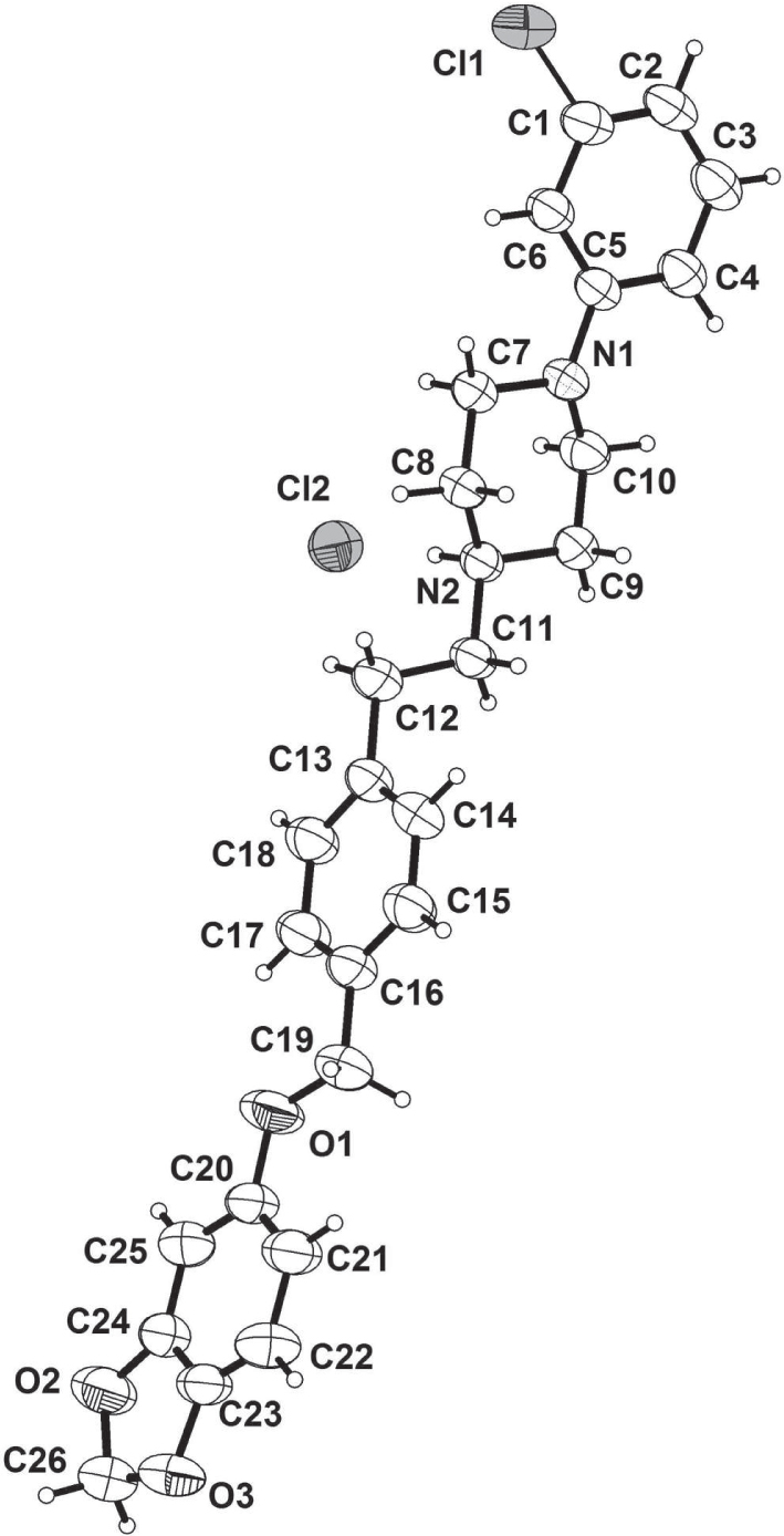 Crystal structure of 1-(4-((benzo[d][1,3]dioxol-5-yloxy)methyl)phenethyl)-4-(3-chlorophenyl) piperazin-1-ium chloride, C26H28Cl2N2O3
