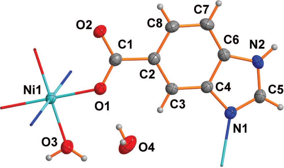 As shown in the figure, the Ni ion lies in a slightly distorted environment, consisting of two oxygen donors from two carboxylate groups, two oxygen atoms from two water ligands, and two benzimidazole nitrogen atoms from two ligands. The adjacent Ni ions are linked by the 1H-benzo[d]imidazole-5-carboxylato ligands to form a 1D chain through. The adjacent 1D chains are linked to a network through hydrogen bonds.