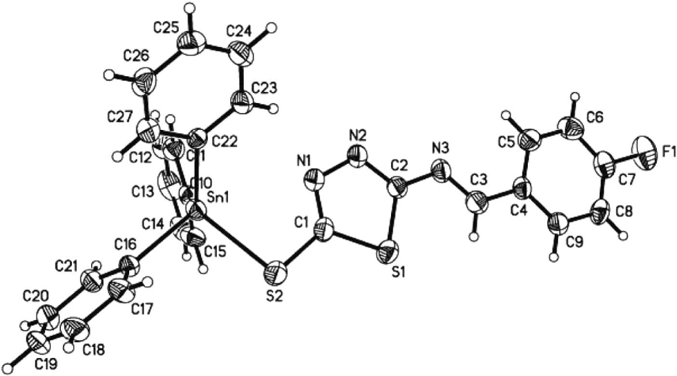 The ligand: 5-((4-fluorobenzylidene)amino)thiophene-2-thiol was synthesized by 4-fluorobenzaldehyde and 5-aminothiophene-2-thiol by refluxing in ethanol for 2 h (yellow solid). The organic ligand and triphenyltin chloride were added to benzene and sodium ethoxide, refluxed for 2 h and filtered off. The solution is evaporated to dryness and recrystallization was done in dichloromethane. The resulting colorless block-shaped crystals were obtained by slow cooling. The yield is 78% and elemental analysis: calc. for C27H20FN3S2Sn: C 55.12, H 3.44, N 7.14; found: C 55.31, H 3.69, N 6.53. The elemental analyses were performed with PERKIN ELMER 2400 SERIES II.