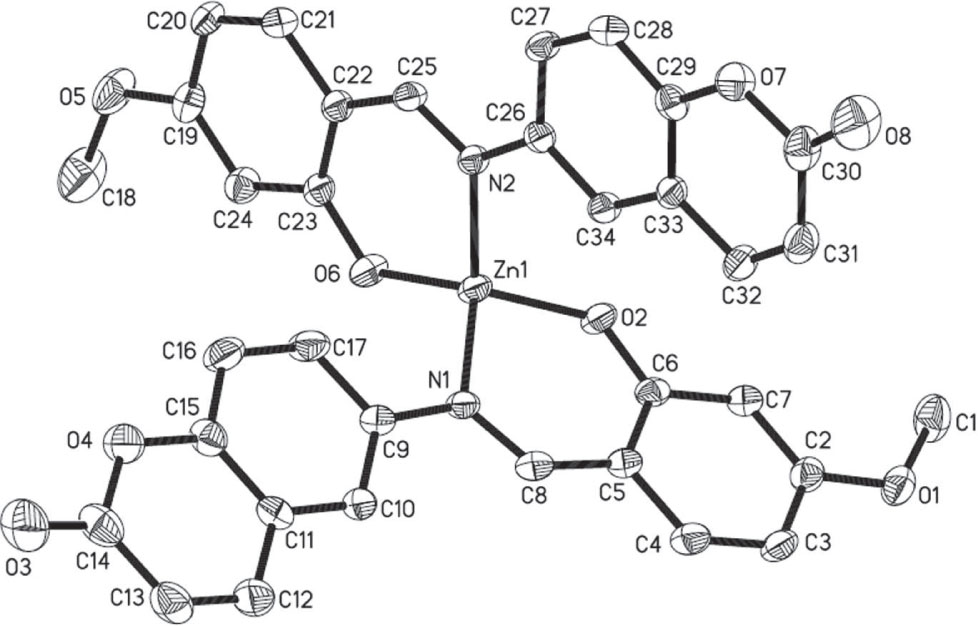 - Crystal structure of bis{5-methoxy-2-(((2-oxo-2H-chromen-6-yl)imino)methyl)phenolato-κ2N,O}zinc(II), C34H24N2O8Zn