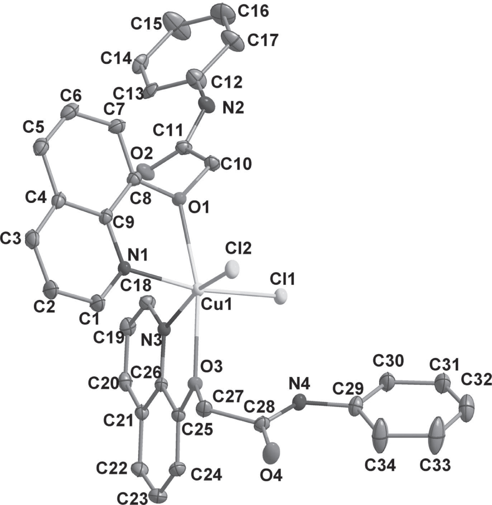 N-phenyl-2-(quinolin-8-yloxy)acetamide [1] (0.280 g, 1 mmol) was dissolved in acetone (10 mL), then an acetone solution (10 mL) of copper(II) chloride dihydrate (0.179 g, 1 mmol) was added at room temperature. After stirring for 2 h, the mixture was filtered and set aside to crystallize at room temperature for several days, giving green block crystals.