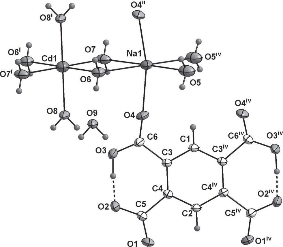 Single crystal X-ray analysis shows that the title compound exhibits a one-dimensional chain. This structure is isostructural to other reported compounds that the Cd2+ ions were substitued by Co2+ [7], Zn2+ [8], Mn2+, Ni2+ [9], Cu2+ [10] and Mg2+ [11]. There is one quarter of a CdII atom, one half of a NaI atom, one half H2Btec ligand, four halfs coordinating aqua and one half of a lattice water in the asymmetric unit. Each Na atom is hexa-coordinated by O atoms including two carboxylate O atoms and four water O atoms for a distorted NaO6 octahedron with the Na—O bond distances ranging from 2.292(2) to 2.563(4) Å. The Cd atom also resides in a CdO6 octahedron with the Cd—O bond distances ranging from 2.177(3) to 2.286(3) Å. The CdO6 octahedra connect NaO6 octahedra via edge-sharing O atoms to from a chain of [—NaO6—CdO6—NaO6—]∞, whose two sides are occupied by half deprotonated H2Btec ligands. There exists two intramolecular hydrogen bonds in each H2Btec ligand with the two O—H distances, O2—H3 = 1.37 Å and O3—H3 = 1.02 Å.