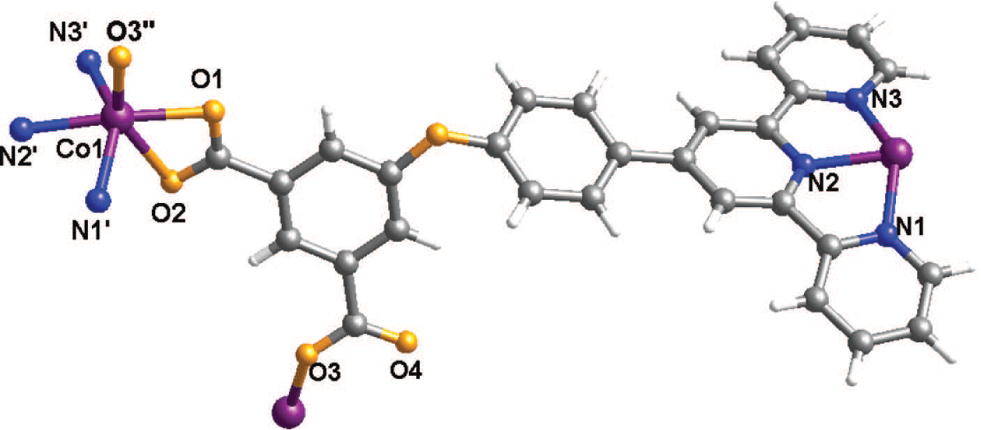 The asymmetric unit contains one Co(II) atom and one fully deprotonated L2− ligand. The geometry around the Co1 atom can be described as a distorted octahedral geometry, and is coordinated by three nitrogen atoms from one L2− ligand and three oxygen atoms form two different L2− ligands. O1, O2, O3 and N2 atoms comprise the equatorial plane, while N1 and N3 occupy the axial positions. The Co1—N bond lengths are from 2.076(2) to 2.152(2) Å, and the Co1—O bond lengths fall in the range 2.021(2)−2.292(2) Å, similarly to previous reports [9, 10] . The two carboxylate groups of the L2− ligand show chelating and monodentate coordination mode, respectively. The chelating carboxylate group and pyridyl nitrogen atoms of L2− ligand bridged adjacent Co1 atoms to give rise to an infinite one-dimensional chain. Adjacent chains are linked through another monodentate carboxylate group to generate two-dimensional layer. The neighboring layers are further linked by hydrogen bonds (C—H—O, H25—O3 2.344(2) Å) to form three-dimensional network.
