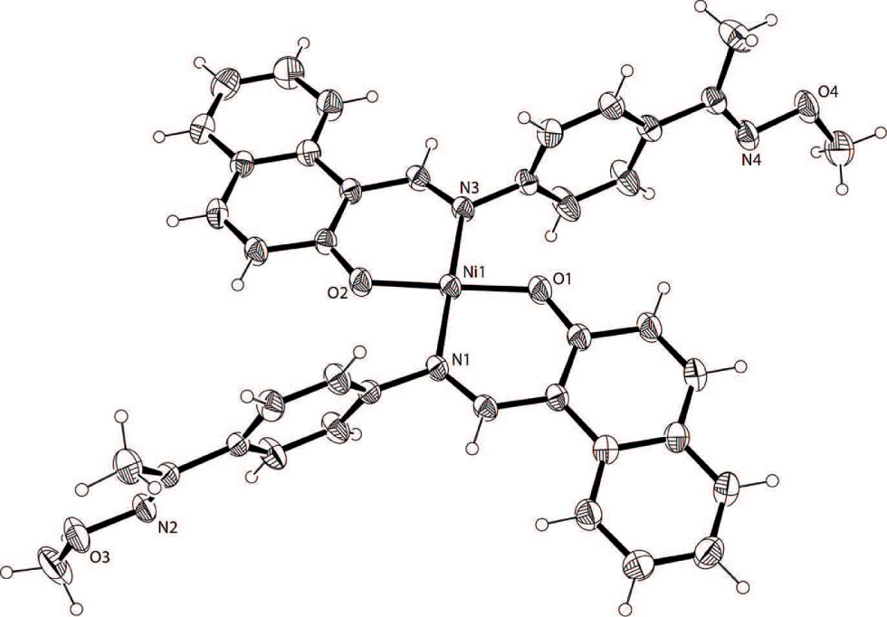 14. Synthesis and crystal structure of bis{((E)-((4-((E)-1-(methoxyimino)ethyl)phenyl)imino)methyl)-2-naphtholato-κ2N,O}nickel(II), C40H34N4NiO4