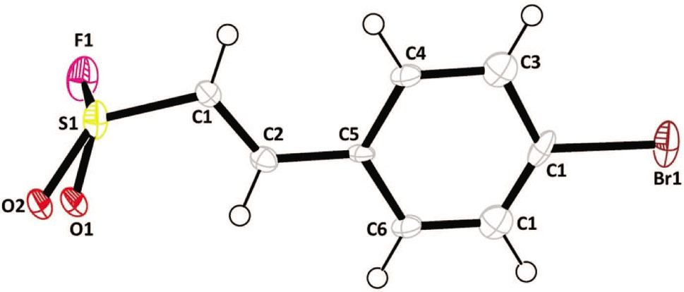 A tube was charged with a solution of ethenesulfonyl fluoride (1.47 mmol, 49.8 mL) in 2.0 mL of dry THF was added Pd(OAc)2 (0.05 mmol), Cu(OAc)2 (0.99 mmol), LiOAc (0.59 mmol) under inert atmosphere. Thereafter 4-bromo boronic acid (0.49 mmol) dissolved in dry THF (2.0 mL) was added to the reaction mixture drop wise via a syringe over ∼30 min. The reaction mixture was stirred at room temperature for 3–5 h and the reaction progress was monitored using TLC. Upon completion, the reaction mixture was filtered through a plug of Celite. The filtrate was concentrated under vacuum and purified through silica gel 60 mesh column chromatography using 2–4% ethyl acetate in hexane as eluent to obtain the pure (E)-2-(4-bromophenyl)ethenesulfonyl fluoride. 15 mg of the title compound was dissolved in 1 mL of distilled ethyl acetate and kept in a 5 mL vial covered with aluminium foil for the slow evaporation of the solvent at ambient condition. Single crystals suitable for X-ray diffraction were obtained after three days upon complete evaporation of the solvent.