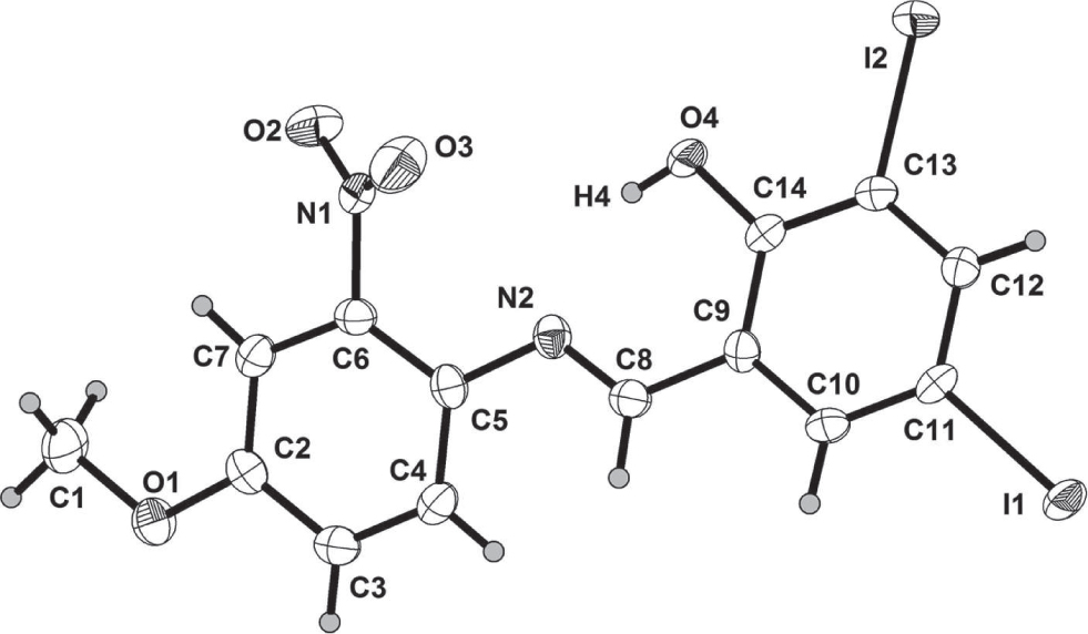 - Crystal structure of (E)-4,6-diiodo-2-(((4-methoxy-2-nitrophenyl)imino)methyl)-3-methylphenol, C14H10I2N2O4
