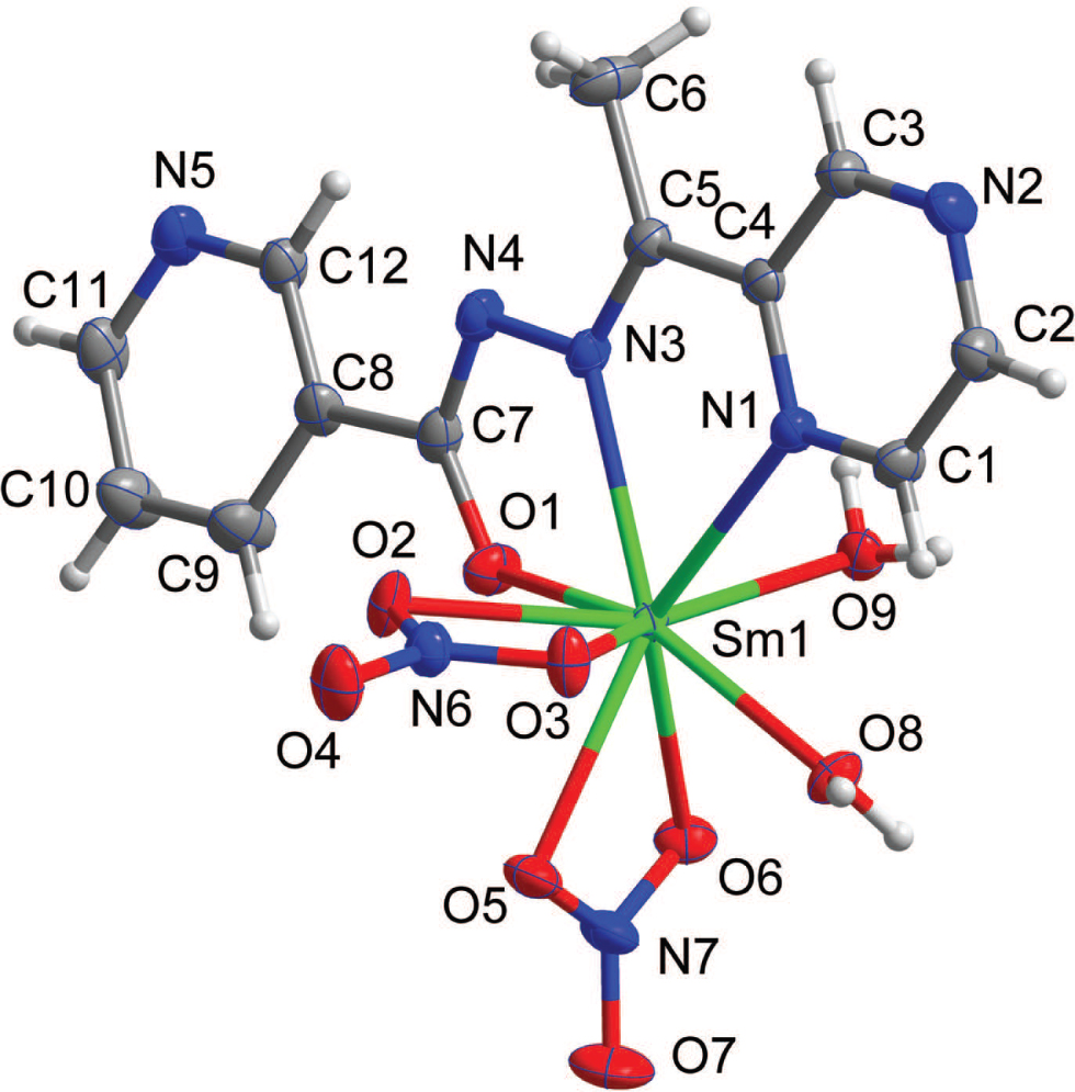 As depicted in the figure, the title complex is a mononuclear coordinational compound in which the six-coordinated Sm3+ is surrounded by one acylhydrazone ligand, two water molecules an two nitrato ligands, thus giving distorted octahedral geometry. The bond lengths of Sm—O and Sm—N (2.307(2)−2.641(3) Å) in the title complex are comparable with those found in our previous work [6]. In the solid state, the three dimensional framework is constructed by the intermolecular O—H⋯O and O—H⋯N hydrogen bonds between all moieties.