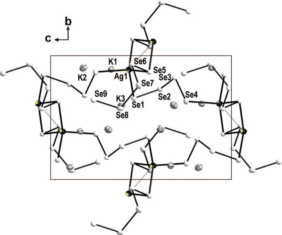 Compared to other polychalcogenidometallates, polyselenidoargentates have been relatively less explored. A few known polyselenidoargentates are [Ag(Se4)]nn−, [Ag(Se4)]44−, [Ag(Se5)]nn−, and [Ag4(Se4)3]2− as stabilized with symmetric organic cations such as R4N+ (R = Me, Et, n-Pr) and Ph4P+ [1, 2] . Most of the previously known polyselenidoargentates were synthesized by the solution method. To explore new polyselenidoargentates we adopted a solventothermal synthetic method and asymmetric organic cations such as Et3MeN+. A ternary silver selenide, K3AgSe9 has been obtained and found to contain a new polyselenidoargentate, [Ag(Se4)(Se5)]3− as stabilized with K+ cations. So far, structurally characterized ternary silver selenides are as follows: KAgSe [3], KAg3Se2 [4], K2Ag4Se3 [5], RbAg5Se3 [6], M2Ag12Se7 (M = K, Tl) [7, 8] , MAgSe4 (M = Rb, Cs) [9]. These ternary silver selenides consist of Se2−monoselenides, except MAgSe4 with (Se4)2− tetraselenide ligands.