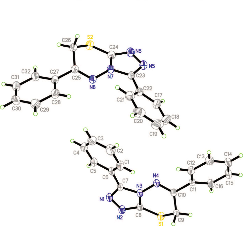 In the title crystal structure there are two crystallographic independent molecules in the asymmetric unit. All bond lengths and angles are in normal range. The triazole ring and the thiadiazine ring in each independent molecule are almost coplanar, with the dihedral angle of 7.32(13)° and 9.27(12)°, respectively. The dihedral angle between the two triazole rings is 83.36(0.28)° and that between the two thiadiazine rings is 82.94(4)°. Both the S—C and C—N bond lengths are in agreement with the values in related compounds. The short C—N bond lengths of 1.304(3) Å (N1—C7), 1.301(3) Å (N2—C8), 1.304(3) Å (N5—C23) and 1.300(3) Å (N6—C24), respectively, suggest partially localized double bonds. The C—N bond lengths are 1.280(3) Å (N4—C10) and 1.277(3) Å (N8—C25), respectively, which are shorter than the typical C=N bond length (1.34 Å–1.38 Å).