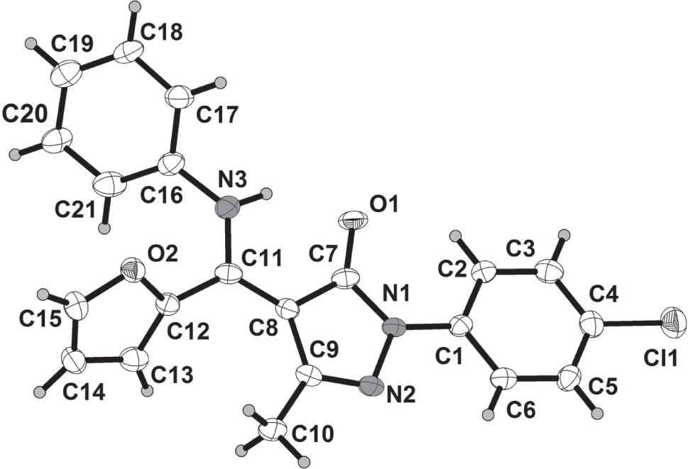 - Crystal structure of (Z)-2-(4-chlorophenyl)-4-(furan-2-yl(phenylamino)methylene)-5-methyl-2,4-dihydro-3H-pyrazol-3-one, C21H16ClN3O2