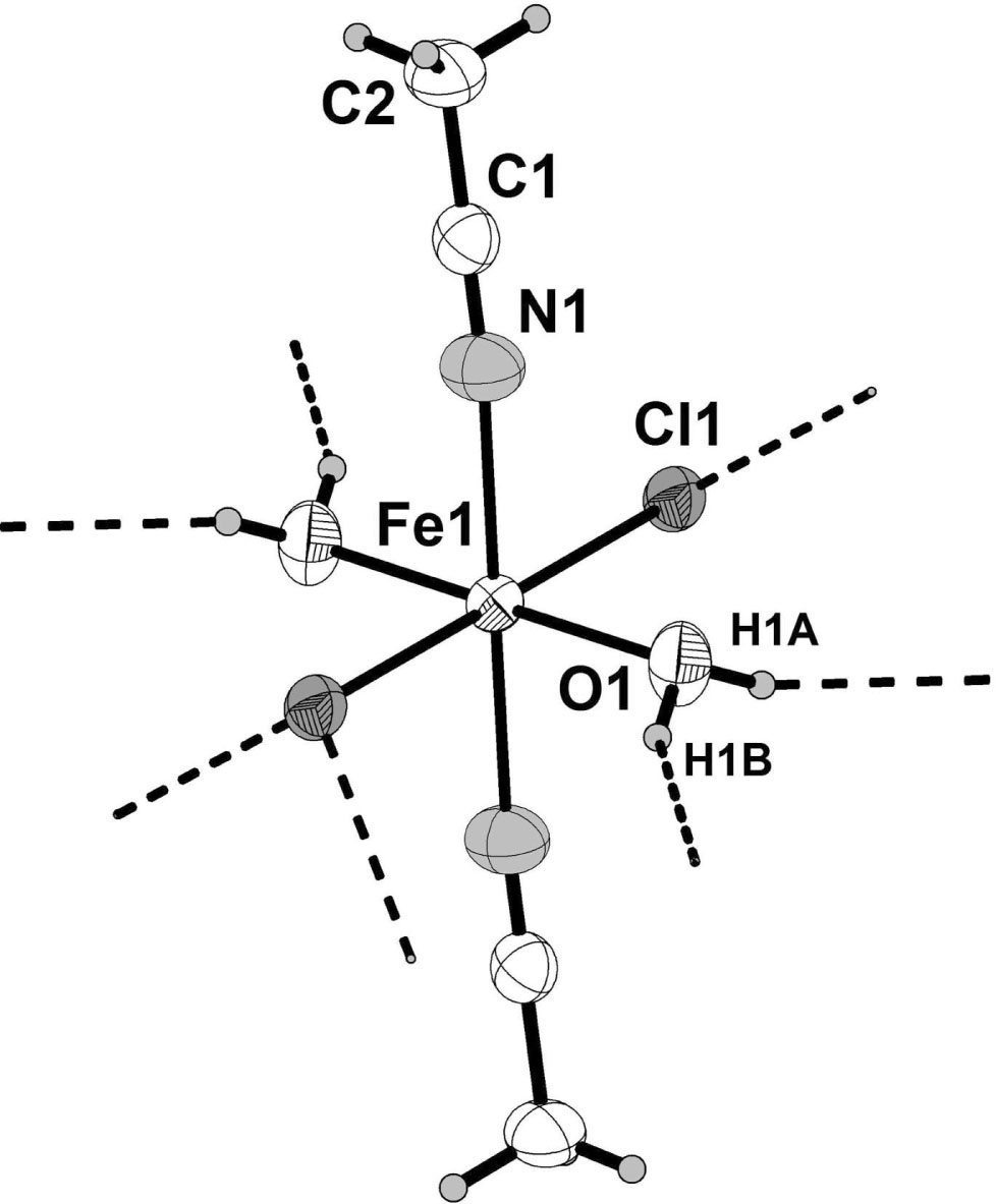 In this paper, we report the synthesis and crystal structure of a iron complex with acetonitrile ligand. The title structure contains one iron ion, two chloride ions, two acetonitrile ligands and two coordinated water molecules located at a center of inversion. The iron atom is six-coordinated by two chlorido ligands, two N atoms from two acetonitrile ligands and two coordinated water O atoms. Among them, the Fe–O bond lengths are 2.079(3) Å, Fe–N bond lengths are 2.225(4) Å and the Fe–Cl ones are 2.4777(9) Å, respectively. Bond lengths are in the expected ranges [8], [9], [10]. Adjacent complexes are connected by OH⋯Cl hydrogen bonds (cf. the figure).