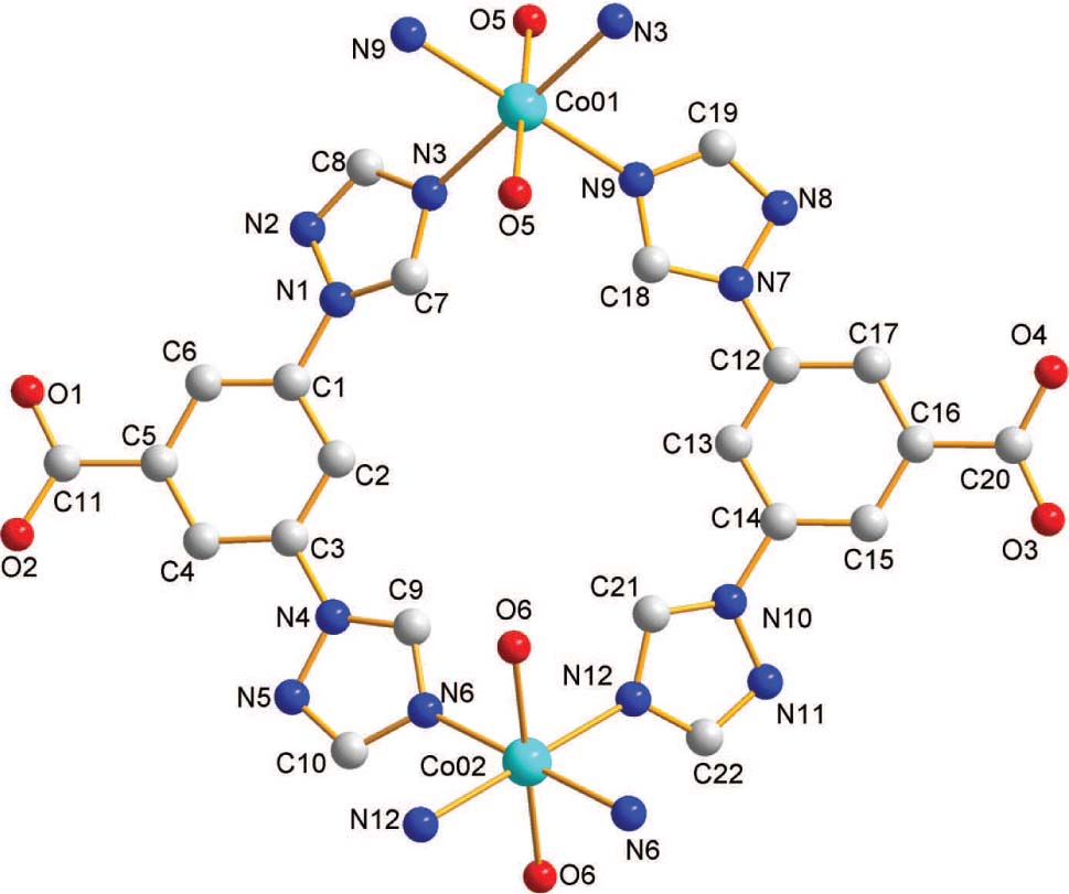 The title compound was prepared by hydrothermal method. A mixture of Co(OAc)2 ⋅ 4 H2O (0.049 g, 0.2 mmol), 3,5-di(1,2,4-triazole-4)benzenecarboxylic acid (0.0256 g, 0.1 mmol), and H2O (10 mL) was sealed in a 25 mL Teflon-lined stainless steel vessel and heated at 160 °C for 4 days. The reaction mixture was slowly cooled to room temperature at a rate of 5 °C/h, and the red block crystals were collected, washed with water, and dried in air.