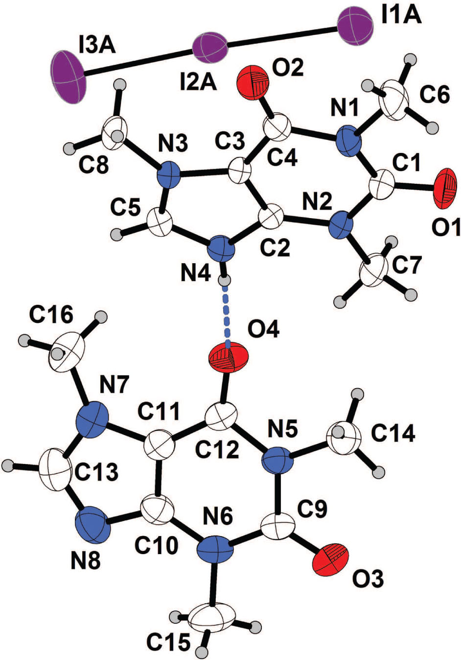 The asymmetric unit of the title crystal structure contains one N-protonated caffeinium cation, one triiodide counter anion and one caffeine molecule (cf. the figure). Bond lengths and angles in the title crystal structure are in the expected ranges. Caffeine is a weak base, a property which is expressed by its structural chemistry. Protonation at the 9-position of the purine moiety (in the title structure at N4) only takes place on reaction with strong acids [17], [18], [19], [20], [21]. Weak organic acids form co-crystals without any transfer of the proton from the organic acid to the caffeine molecule [22], [23]. In the title structure the protonated N atom of the caffeinium cation donates one hydrogen bond to the adjacent neutral caffeine molecule (cf. the figure; N—H = 0.78(3) Å; N⋯O = 2.722(3) Å). The caffeinium cation as well as the caffeine molecule are almost planar [rms deviation of fitted atoms (N1—N4; C1—C5) = 0.022 Å; rms deviation of fitted atoms (N5—N8; C9—C13) = 0.010 Å]. The dihedral angle is 21.37(9)°. In the packing scheme of the title crystal structure there is one triiodide anion above and another one below each caffeinium cation, which rules out any kind of π-π interactions. This feature of packing has been reported earlier [24]. The neutral caffeine molecules are pairwise arranged with an interplanar distance of 3.319(6) Å. The I—I distances in the triiodide anion are in the typical range for triiodide anions not involved in strong secondary interactions [11], [12], [13]. A detailed discussion of the geometric parameters of the anion based on the crystal structure is ruled out by its disorder. Furthermore, there are no intermolecular I⋯I halogen bonds as the shortest I⋯I distances are >4.3 Å.