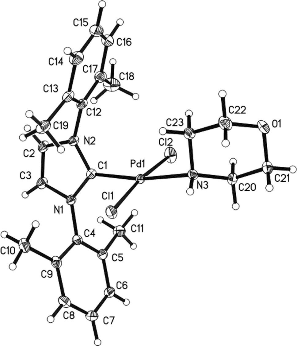 - The crystal structure of dichlorido-(1,3-bis(2,6-dimethylphenyl)-1H-imidazol-2(3H)-ylidene)-(morpholine-κ1N)palladium(II), C23H29Cl2N3OPd(II)