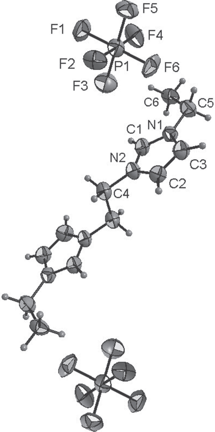 Bond lengths and angles within the imidazloe ring are very similar to those given in the literature for diimidazloe ionic liquid [11], [12], [13], [14]. The asymmetric unit of the title structure consists of one half of C2M2+ cation (1,1′-(ethane-1,2-diyl)bis(3-ethyl-1H-imidazol-3-ium)) and one [PF6]− anion (cf. the figure). Two cationic 1-ethylimidazolium rings were bound to the both sides of ethyl group. The two imidazole rings are crystallographically dependant, planar and parallel to each other. The torsion angle of C4-N2-C2-C3 and C4′-C4-N2-C1 is 178.2° and 86.4° respectively.