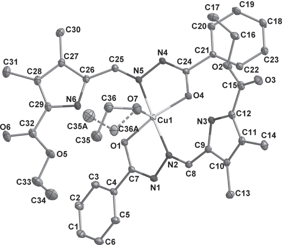 - Crystal structure of ethanol-bis(N-((5-(ethoxycarbonyl)-3,4-dimethyl-1H-pyrrol-2-yl)methylene)benzohydrazonato-κ2N,O)copper(II), C36H42N6O7Cu