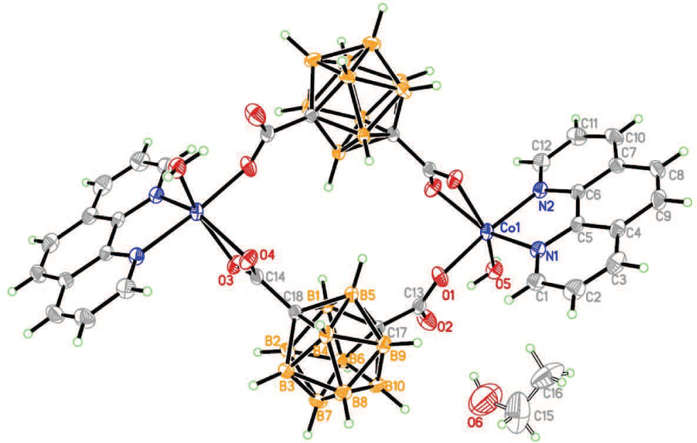 - Crystal structure of diaqua-bis(1,10-phenanthroline-κ2N,N′)-bis(1,7-dicarba-closo-dodecaborane-1,7-dicarboxylato-κ3O,O′:O′′) dicobalt(II) — ethanol (1/1), C34H46B20Co2N4O11