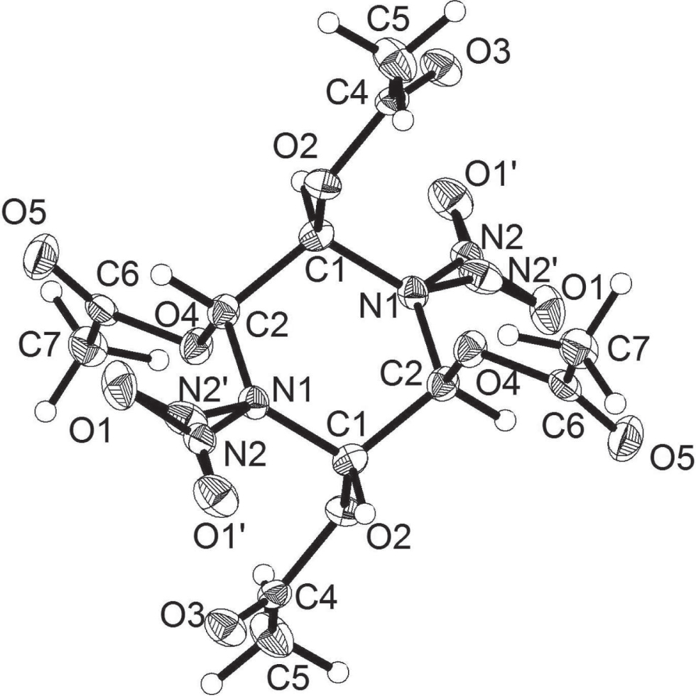 Piperazine derivatives have important applications in the fields of medicinal chemistry and materials [4], [5], [6], [7], [8], [9], [10]. The molecular structure of the title compound (cf. the figure) has two nitroso groups and four acetoxy groups, which are bonded to two nitrogen atoms and four carbon atoms on the piperazine ring, respectively. All bond lengths and angles are within normal ranges and in good agreement with those found for the structure of 1,4-diformyl-2,3,5,6-tetra-acetoxypiperazine, which crystallises in space group P21/n and has been previously reported in the literature [11]. The planes defined by the nitroso group (N1, N2, O1) and by C1, N1, C2 are almost coplanar for the angle between the two planes is 3.52°. The dihedral angle between the two acetoxy groups (C1, O2, C4, O3, C5 and C2, O4, C6, O5, C7) and the plane (C1, C2, C1′, C2′) is 87.41° and 78.73° respectively. The dihedral angle between the plane defined by the nitroso group (N1, N2, O1) and the plane (C1, C2, C1′, C2′) is 49.00°.