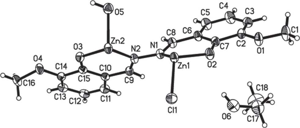 The molecular structure of the title structure contains a discrete neutral [Zn3(L)2(H2O)2Cl2] (H2L = 1,2-bis(2-hydroxy-3-methoxybenzylidene)hydrazine) and two enthanol molecules. As shown in the figure, the asymmetric unit of the title structure consists of one and a half Zn(II) ions, one dianionic ligand, one chloride anion, one coordinated water molecule and one enthanol. Zn1 exhibits a distorted square-pyramidal geometry, coordinated by three oxygens, one nitrogen atom, and one chloride anion. While Zn2 is located on an inversion center, and an octahedral sphere surrounded by two nitrogen atoms, two oxygen atoms from two ligands, and two water molecules. Bond lengths of Zn—O are in the range of 1.959(3) Å to 2.235(3) Å, and the Zn—N bond distances are 2.080(4) and 2.098(4) Å, which are normal [8]. Ethanol molecules stay in the lattices of the supramolecular structure.
