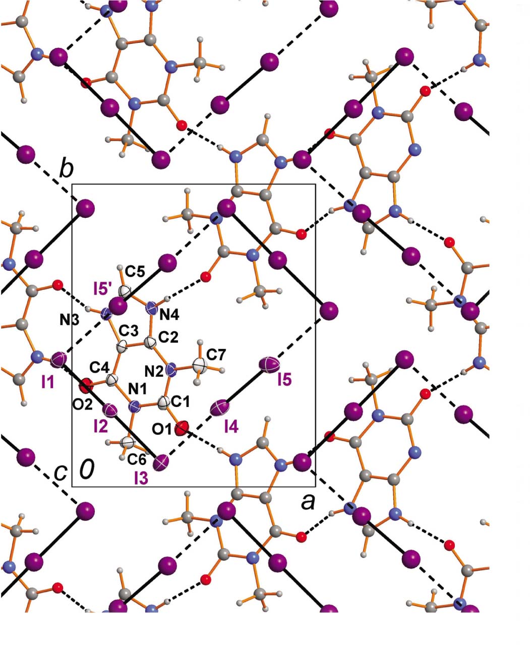 Between adjacent cationic, hydrogen-bonded theophyllinium layers the polyiodide anions are intercalated (see the figure). Each polyiodide I102− moiety consists of two pentaiodide fragments, which show I–I distances which are in the typical range of single bonds to strong secondary interactions (I1–I2: 2.8787(4) Å; I2–I3: 2.9661(4) Å; I4–I5: 2.7636(6) Å; I3⋯I4: 3.3009(5) Å) [9]. The I5⋯I1′ [′ = 1 − x, 1 − y, 1 – z] distance of 3.6582(6) Å is in the typical range of weaker I⋯I interactions, but significantly shorter than any van der Waals distances in the various scales [30]. In the structure of the known cyclic I102−, the four secondary I⋯I distances are crystallographically constrained and are at 3.441(1) Å [28] fairly accurate within the arithmetic mean of the distances derived for the title structure. Further significant I⋯I interactions can be ruled out as the corresponding iodine to iodine distances (>3.9 Å) are very close the sum of the van der Waals radii. The angles within the I102− dianion are in accord with the expectations (I2–I1–I5′: 77.41(1)°; I2–I3–I4: 98.22(1)°; I4–I3–I1–I5′ [′ = 1 – x, 1 – y, 1 – z]). Finally, it is worth mentioning that the hydrogen-bonded layers show a wavy shape fitting excellently with the needs of the neighboring polyiodide anions.
