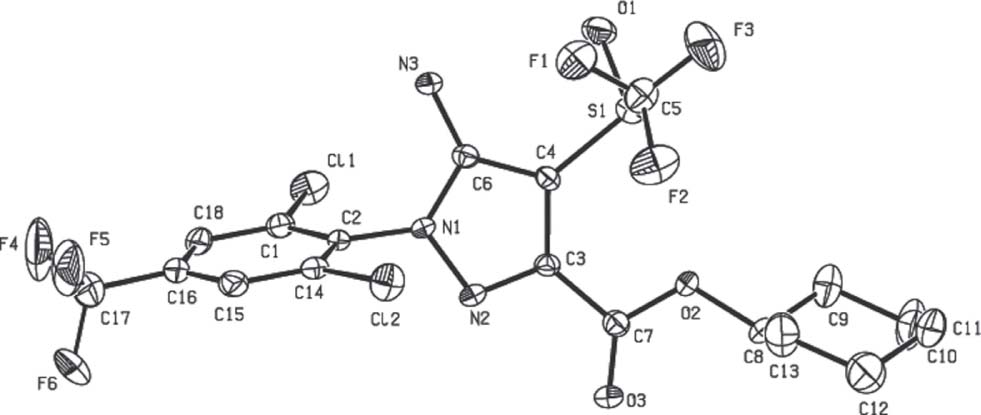The core structure of the title molecule consists of a pyrazole ring. A trifluoromethanesulfinyl group and a cyclohexyl ester group are linked on the peripheral part, and a phenyl ring, which is bridged to the pyrazole ring with N1—C2 bond 1.417(3) Å. The bond distances of C17—F4, C17—F5 and C17—F6 (CF3 groups attached to the phenyl moiety) are 1.290(12) Å, 1.403(9) Å and 1.291(6) Å, respectively and their average bond distance is slightly shorter than the average value of the other CF3 group in the trifluoromethanesulfinyl moiety. The S1—C4 bond distance is 1.744(3) Å, significantly larger than the double bond length of S1—O1 (1.476(2) Å), which is the single bond connecting 5-membered heterocyclic pyrazole ring [10]. The bond length of O3—C7 is 1.205(3) Å, which is shorter than the bond length of O2—C8, 1.460(3) Å. In the crystal structure of title compound, the 2,6-dichloro-4-(trifluoromethyl)phenyl ring is twisted out of the plane of pyrazole ring and the two heterocyclic rings makes a dihedral angle of 74.53(2)°. The ester group is coplanar to the plane of pyrazole ring. However, CF3 group in the trifluoromethanesulfinyl moiety is almost perpendicular to the pyrazole plane and the angle of C4—S1—C5 is 95.97(14)° [11]. The N2—C3 bond distance is 1.315(3) Å, which is the shortest carbon-nitrogen bond.