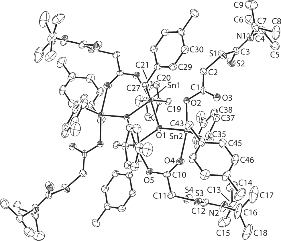 - Crystal structure of bis[(μ3-oxido)-(μ2-(N,N-diisopropylthiocarbamoylthio) acetato-κ2O,O′)-((N,N-diisopropylthiocarbamoylthio)acetato-κO)-bis(di-4-methylbenzyl-tin(IV))], C100H136N4O10S8Sn4