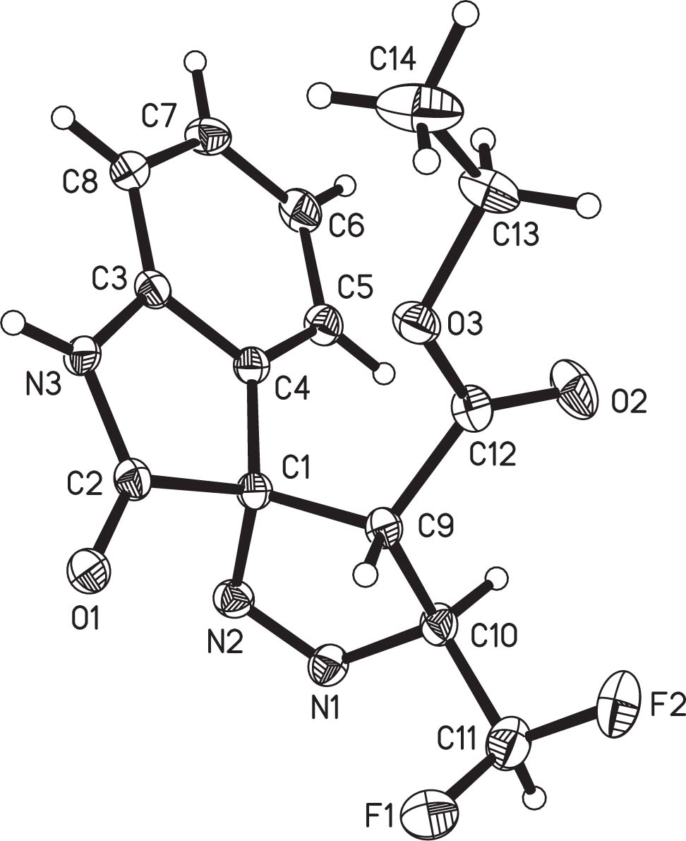 The mixture of CF2HCH2NH2 (1.0 mmol), tBuONO (1.2 mmol), AcOH (0.15 mmol) and DCM (dichloromethane; 20 mL) was stirred at 70 °C for about 10 min. The mixture was placed at room temperature, then was added (E)-ethyl 2-(2-oxoindolin-3-ylidene)acetate (0.3 mmol). The reaction was monitored by thin-layer chromatography (TLC), which showed the disappearance of (E)-ethyl 2-(2-oxoindolin-3-ylidene)acetate that was indicative of the reaction being complete. After DCM was removed under reduced pressure, the residue was purified by column chromatography on silica gel column using petroleum ether/ethyl acetate (6:1, v/v) to give the corresponding pure title compound. Crystals were obtained at room temperature from the mother liquor.