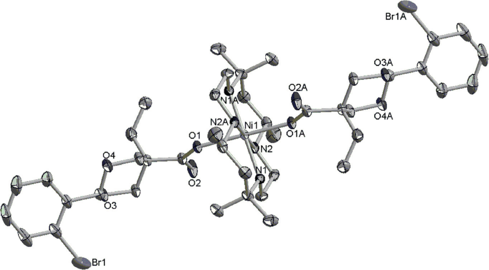 - Crystal structure of bis[(2-(3-bromophenyl)-5-methyl-1,3-dioxane-5-carboxylato-κ-O)-(5,5,7,12,12,14-hexamethyl-1,4,8,11-tetraazacyclotetradecane-κ4N,N′,N′′,N′′′)]nickel(II), C40H60Br2N4NiO8