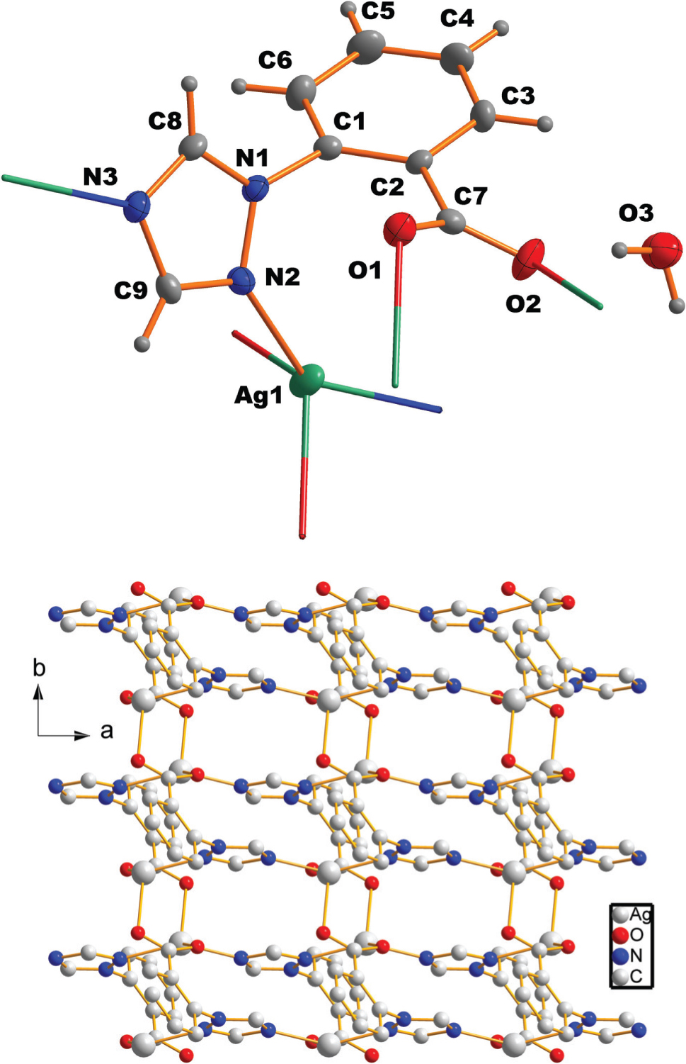 The asymmetric unit of the title compound consists of one crystallographically independent Ag(I) ions, one 2-(1,2,4-triazol-2)benzenecarboxyl ligand, and one coordinated water molecule (Figure, upper part). The Ag(I) center is four-coordinated with distorted tetrahedral geometry. The geometry is completed by two nitrogen atoms and two oxygen atoms from four different ligands. The Ag—N bond lengths are 2.257(2) and 2.273(2) Å, and the Ag—O bond lengths are 2.416(2) and 2.523(2) Å, respectively. The 2-(1,2,4-triazol-2)benzenecarboxylato ligand is deprotonated. The carboxyl group connect with two Ag(I) ions, the triazole also coordinate with two Ag(I) ions. By this mode, the organic ligands connect adjacent Ag(I) ions, give a 2D framework, as shown in the lower part of the figure.