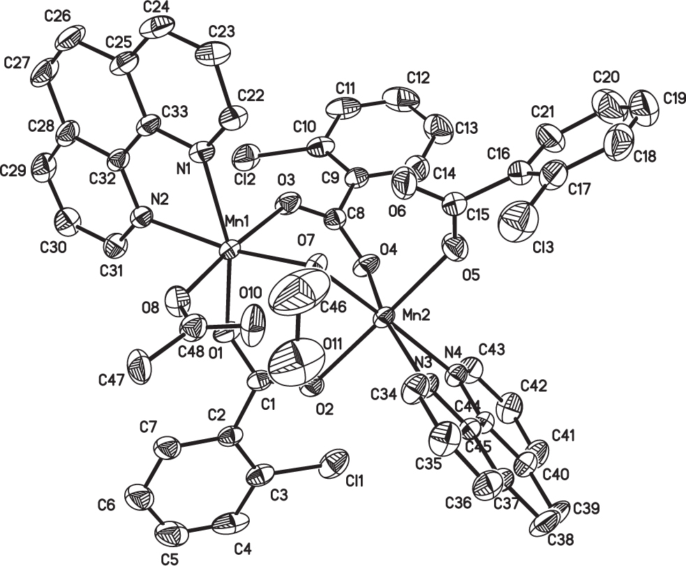 The crystal structure shows two carboxylic ligands and one oxygen atom bridge two Mn atoms and two phen ligands chelate two Mn atoms, respectively. Acetic acid and a 2-chlorobenzoic acid group coordinate to one Mn atom, respectively. Both Mn atoms show six-coordinated octahedron geometry. For Mn1, the angle of O3-Mn1-O8 is 172.33(19)°, showing the geometry is distorted. Meanwhile, for Mn2, the angle of O2-Mn2-O5 is 174.69(10)°. The bond lengths of Mn—O are 2.115(2) Å – 2.216(2) Å and the bond lengths of Mn—N are from 2.236(3) Å to 2.298(3) Å. The bridged O atom is almost in the middle of two Mn atoms for the O7-Mn1 is 2.208(2) Å and O7-Mn2 is 2.216(2) Å.