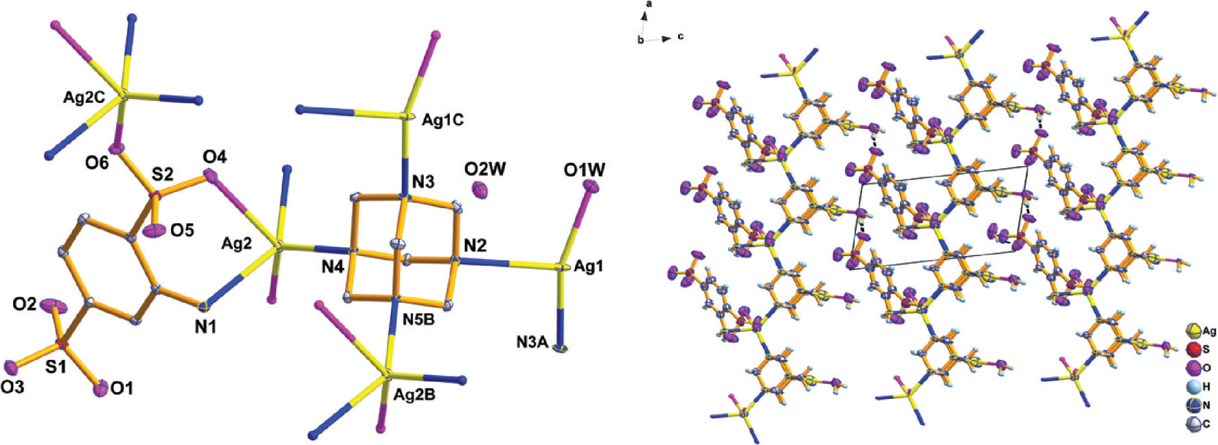 In the paper, an interesting coordination polymer is described which contains different silver atoms in different coordination environment. As is depicted in the left part of the figure, the Ag1 is three-coordinated by two nitrogen atoms from two hexamethylenetetramine ligands and one oxygen atom from water. The Ag2 is five-coordinated by three nitrogen atoms from two hexamethylenetetramine ligands, the 2-amino-1,4-benzenedisulfonato ligand and two oxygen atoms from sulfonato groups of different 2-amino-1, 4-benzenedisulfonato ligands [7]. The bond distances of Ag—N range from 2.3213(2) to 2.3995(2) Å and the Ag—O range from 2.1610(1) to 2.6422(2) Å within the normal range of the literatures which have reported [8] and there is one free water molecule. Above all, the weak interactions such as NH⋯O, OH⋯O play an extremely important role in making it become three-dimensional supermolecule structure [9]. And O1W⋯H1B could not produce interaction after calculating (cf. right part of the figure). (symmetry codes used in the figure: A = x, −1 + y, z; B = −1 + x, y, z; C = x, 1 + y, z)