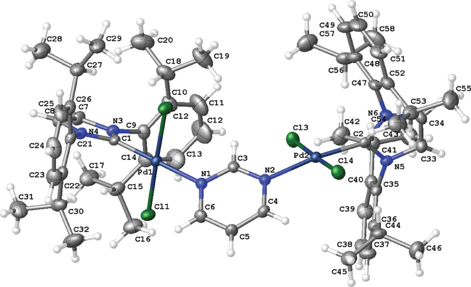 In the crystal structure, two nearly square-planar Pd(II) centers were found bridged by the bidentate pyrimidine ligand. Both palladium centers are coordinated by four ligands such as NHC, pyrimidine, and two chloro ligands in a slightly distorted square-planar geometry. Both palladium centers have the similar bond lengthes and bond angles. For example, the bond lengthes around the palladium centers are: Pd(1)—Cl(1) = 2.2934(9); Pd(1)—Cl(2) = 2.2927(9); Pd(1)—N(1) = 2.088(3); Pd(1)—C(1) = 1.961(3); Pd(2)—Cl(3) = 2.2965(9); Pd(2)—Cl(4) = 2.2991(9); Pd(2)—N(2) = 2.120(3); Pd(2)—C(2) = 1.966(3). The bond angles around the palladium centers are: Cl(1)—Pd(1)—Cl(2) = 178.38(4); N(1)—Pd(1)—Cl(1) = 89.04(8); N(1)—Pd(1)—Cl(2) = 89.40(8); C(1)—Pd(1)—Cl(1) = 90.08(10); C(1)—Pd(1)—Cl(2) = 91.49(10); Cl(3)—Pd(2)—Cl(4) = 177.29(4); N(2)—Pd(2)—Cl(3) = 90.57(8); N(2)—Pd(2)—Cl(4) = 89.43(8); C(2)—Pd(2)—Cl(3) = 91.04(10); C(2)—Pd(2)—Cl(4) = 89.29(10); C(2)—Pd(2)—N(2) = 173.02(12)°. In addition, the bond lengthes and bond angles are all comparable to those found in the pyrazine derived analogue [14], [15].