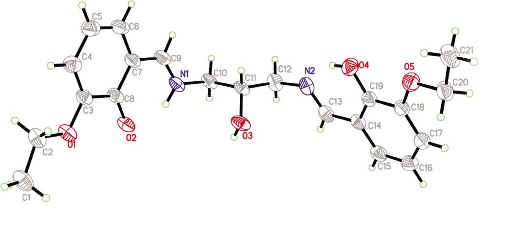 The compound crystallizes in the monoclinic space group P21/c with four formula units in the unit cell. As shown in the figure, each molecule formally consists of two 3-ethoxysalicylidenyl and one 2-hydroxyl-1,3-propanediamine-diyl moieties. It is observed that the phenolic proton is transferred to the imine nitrogen in the structure of this molecule to yield a ylidic structure. The NH group and phenolate O atom form a strong intramolecular N—H⋯O hydrogen bond. The N—H⋯O hydrogen-bonded rings are almost planar and coupled with the cyclohexadiene rings [7], [8].