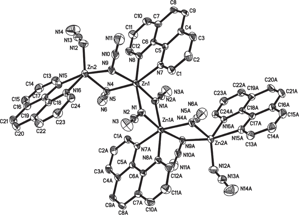 Single crystal X-ray diffraction indicated that 1 belongs to the triclinic system with the space group P1̄. The molecular structural unit of 1 contains four Zn2+ cations, four C12H8N2 ligands and eightN3− anions as shown in the figure. Within the title complex Zn1 is six-coordinated by six N atoms from one C12H8N2 ligand and four N atoms from four N3− ligands. Zn2 cation is five-coordinated by five N atoms from one C12H8N2 ligand and three N atoms from three N3− ligands. The bond distances Zn—N, N—N and the bond angles of N—Zn—N are in the ranges of 1.966(3)–2.209(2) Å, 1.129(3)–1.196(3) Å and 76.53(8)–168.68(9)°, respectively. These above mentioned bond distances and angles are all in their normal ranges. They can be compared with those previously reported compounds [8]. By means of such connected modes, a tetra-nuclear coordination compound was generated. The distances of Zn⋯Zn are 3.251 Å and 3.338 Å. It is worth noting that the eight N3− ligands exhibited two types of coordination fashions: six N3− ligands as bridged ligands linked to two Zn2+ cations (Zn1 and Zn2) and two N3− ligands as terminal ligands connected to Zn2. In addition, C—H⋯N hydrogen bonds are found in the packing structure of 1.